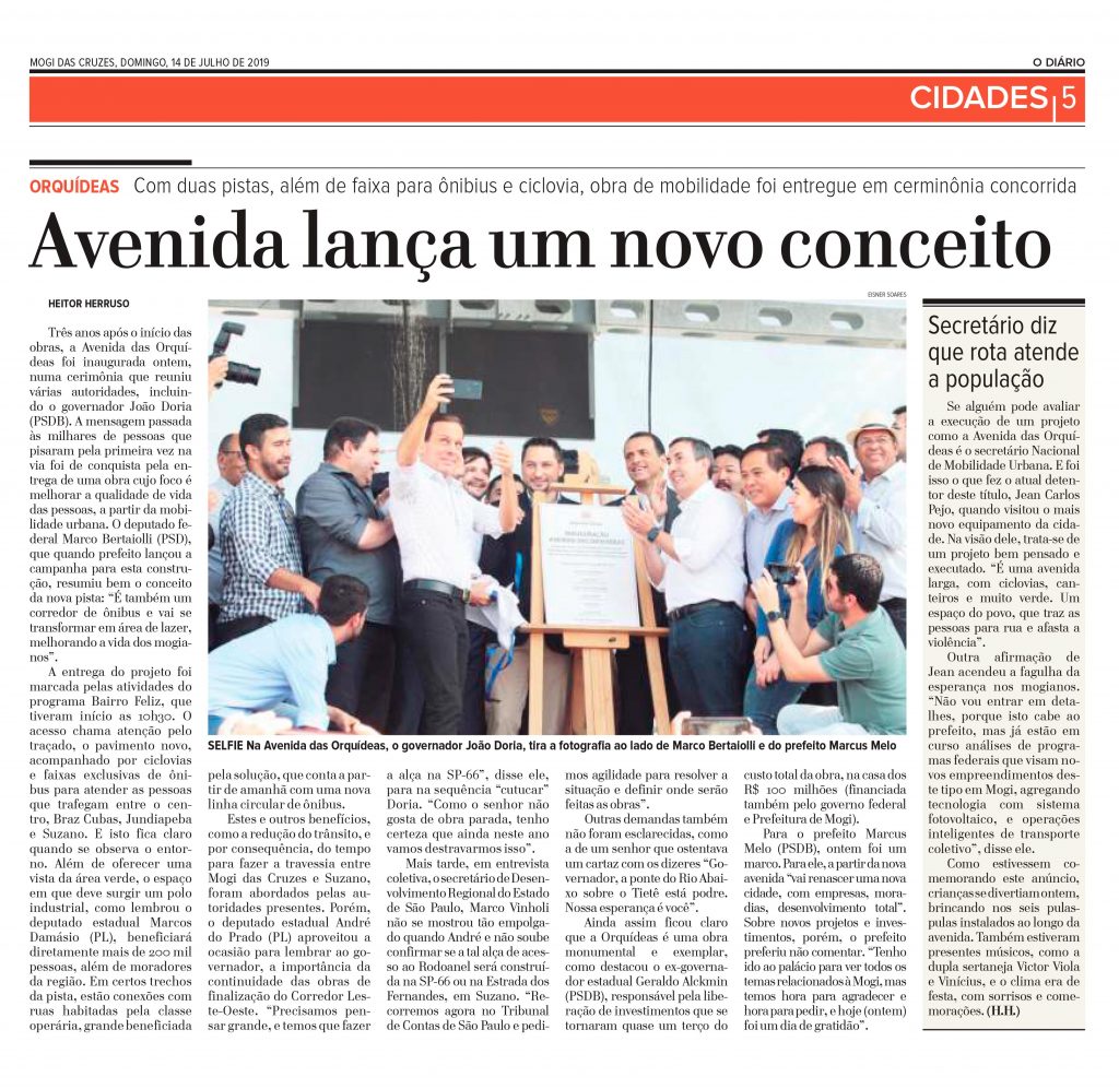 Três anos após o início das obras, a Avenida das Orquídeas foi inaugurada neste sábado (13), numa cerimônia que reuniu várias autoridades, incluindo o governador João Doria (PSDB). A mensagem passada às milhares de pessoas que pisaram pela primeira vez na via foi de conquista pela entrega de uma obra cujo foco é melhorar a qualidade de vida das pessoas, a partir da mobilidade urbana. O deputado federal Marco Bertaiolli (PSD), que quando prefeito lançou a campanha para esta construção, resumiu bem o conceito da nova pista: “É também um corredor de ônibus e vai se transformar em área de lazer, melhorando a vida dos mogianos”.