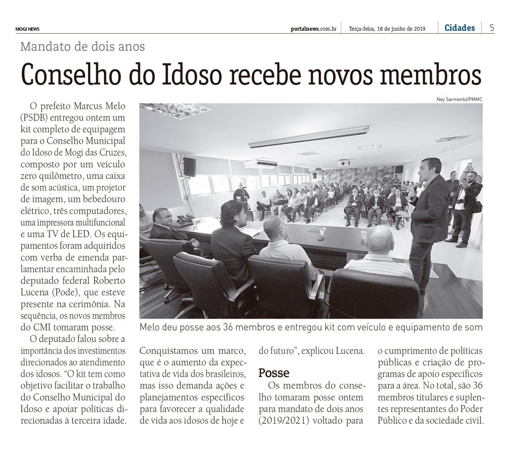 O prefeito Marcus Melo (PSDB) entregou ontem um kit completo de equipagem para o Conselho Municipal do Idoso de Mogi das Cruzes, composto por um veículo zero quilômetro, uma caixa de som acústica, um projetor de imagem, um bebedouro elétrico, três computadores, uma impressora multifuncional e uma TV de LED. Os equipamentos foram adquiridos com verba de emenda parlamentar encaminhada pelo deputado federal Roberto Lucena (Pode), que esteve presente na cerimônia. Na sequência, os novos membros do CMI tomaram posse.