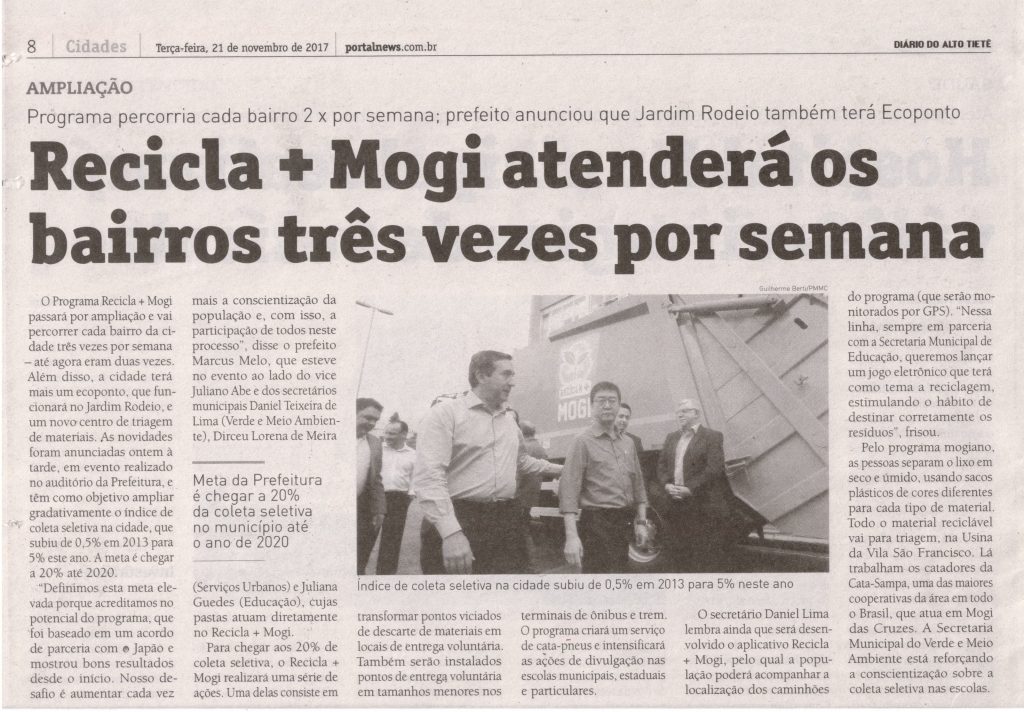 Ao lado do prefeito, Juliano anuncia ampliação do Recicla + Mogi.