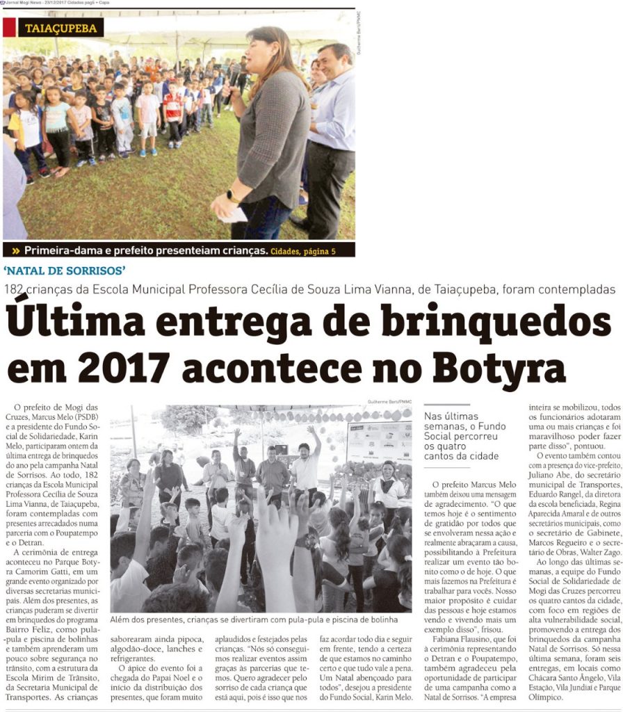 Ao do prefeito e da primeira-dama, Juliano entrega brinquedos arrecadados pelo Fundo Social a crianças de Taiaçupeba.