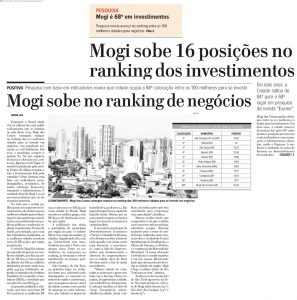Enquanto o Brasil ainda vive os reflexos da crise político-financeira que se instalou no país deste 2015, Mogi das Cruzes conseguiu avançar no ranking das 100 melhores cidades para investir em negócios, com população acima de 100 mil habitantes. Em 2017, o município ocupava a posição 84. No ano seguinte alcançou a colocação 75 e, neste ano, figurou no 68º lugar. O estudo foi publicado pela revista Exame da última semana e traz o levantamento feito pela consultor Urban Systems com base em indicadores sociodemográfico, econômico, de saúde, educação, financeiro, transporte e infraestrutura. O resultado final de Mogi é 10,26 em uma pontuação que vai até 26 pontos possíveis.