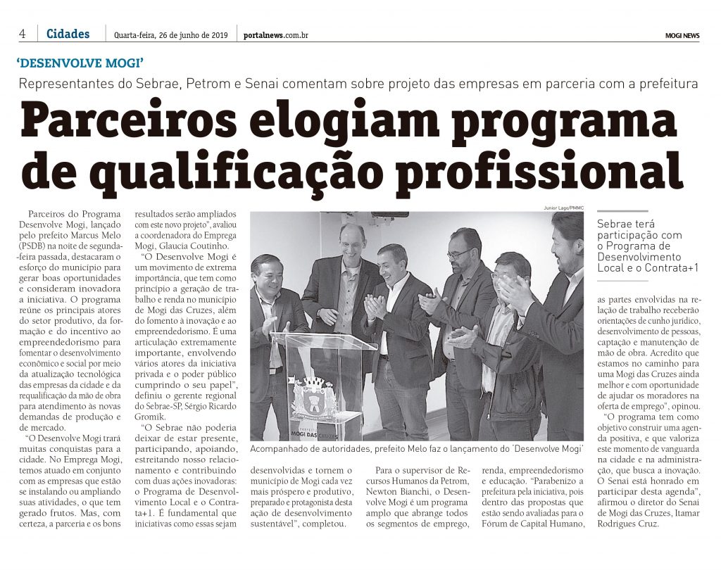 Parceiros do Programa Desenvolve Mogi, lançado pelo prefeito Marcus Melo (PSDB) na noite de segunda-feira passada, destacaram o esforço do município para gerar boas oportunidades e consideram inovadora a iniciativa. O programa reúne os principais atores do setor produtivo, da formação e do incentivo ao empreendedorismo para fomentar o desenvolvimento econômico e social por meio da atualização tecnológica das empresas da cidade e da requalificação da mão de obra para atendimento às novas demandas de produção e de mercado.