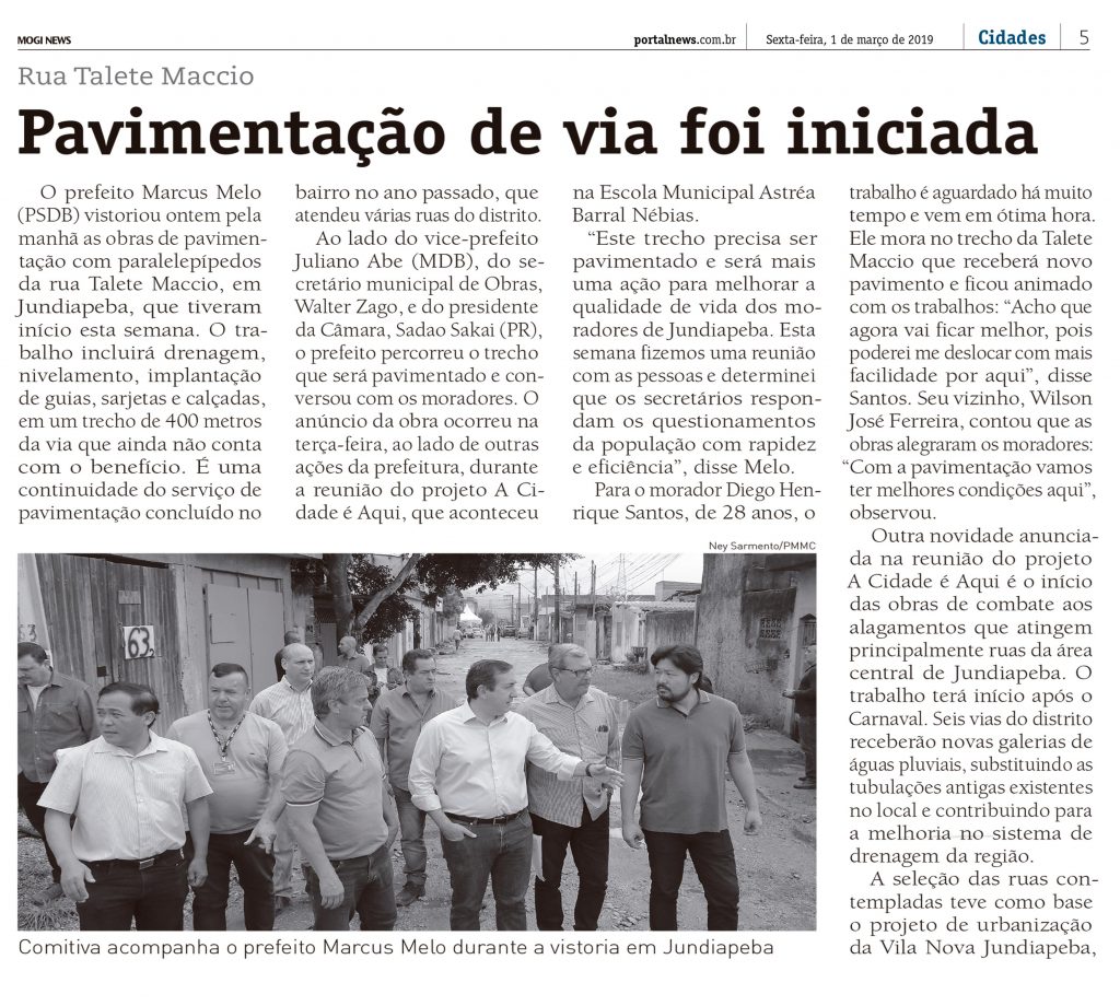 O prefeito Marcus Melo (PSDB) vistoriou ontem pela manhã as obras de pavimentação com paralelepípedos da rua Talete Maccio, em Jundiapeba, que tiveram início esta semana. O trabalho incluirá drenagem, nivelamento, implantação de guias, sarjetas e calçadas, em um trecho de 400 metros da via que ainda não conta com o benefício. É uma continuidade do serviço de pavimentação concluído no bairro no ano passado, que atendeu várias ruas do distrito.