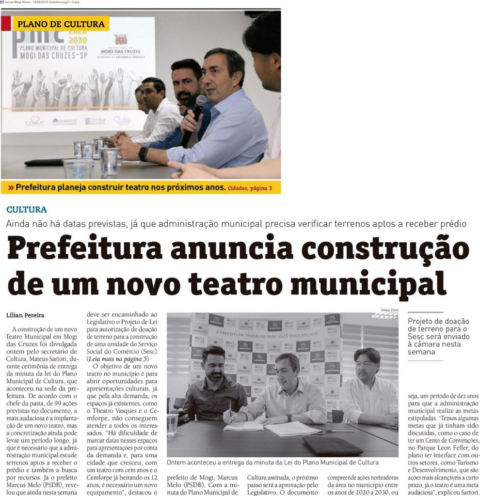 A construção de um novo Teatro Municipal em Mogi das Cruzes foi divulgada ontem pelo secretário de Cultura, Mateus Sartori, durante cerimônia de entrega da minuta da lei do Plano Municipal de Cultura, que aconteceu na sede da prefeitura. De acordo com o chefe da pasta, de 99 ações previstas no documento, a mais audaciosa é a implantação de um novo teatro, mas a concretização ainda pode levar um período longo, já que é necessário que a administração municipal estude terrenos aptos a receber o prédio e também a busca por recursos. Já o prefeito Marcus Melo (PSDB), revelou que ainda nesta semana deve ser encaminhado ao Legislativo o Projeto de Lei para autorização de doação de terreno para a construção de uma unidade do Serviço Social do Comércio (Sesc).(Leia mais na página 5)