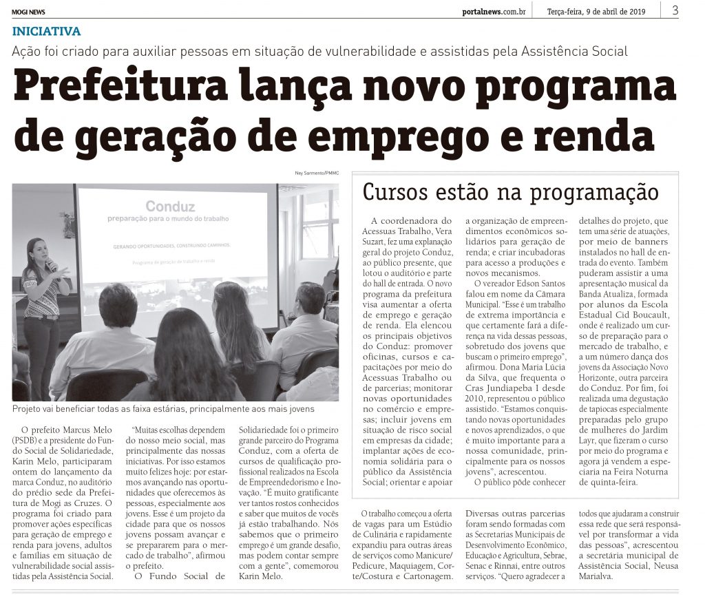 O prefeito Marcus Melo (PSDB) e a presidente do Fundo Social de Solidariedade, Karin Melo, participaram ontem do lançamento da marca Conduz, no auditório do prédio sede da Prefeitura de Mogi as Cruzes. O programa foi criado para promover ações específicas para geração de emprego e renda para jovens, adultos e famílias em situação de vulnerabilidade social assistidas pela Assistência Social.