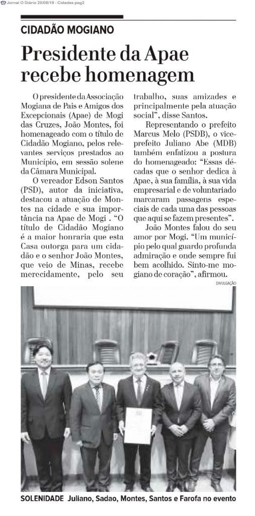 Hoje, às 20 horas, o presidente da Associação de Pais e Amigos dos Excepcionais (Apae) de Mogi das Cruzes, João Montes, recebe o título de Cidadão Mogiano, na Câmara de Mogi das Cruzes. A autoria do projeto é do vereador Edson Santos (PSD).