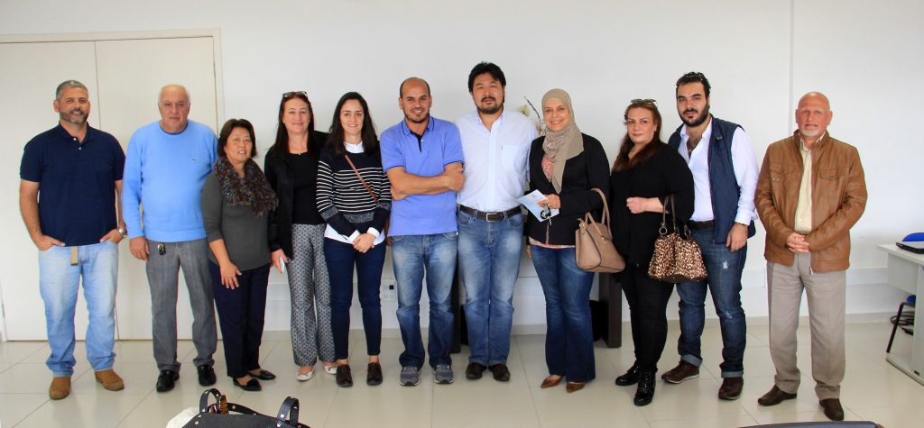 Grupo formado por refugiados da Síria, Egito e Palestina, secretários Neusa Marialva e Renato Abdo, presidente da ONG Refúgio Brasil, Faysa Daoud, e o ex-vereador Nabil Safiti na reunião com Isabela Mazão, da ONU