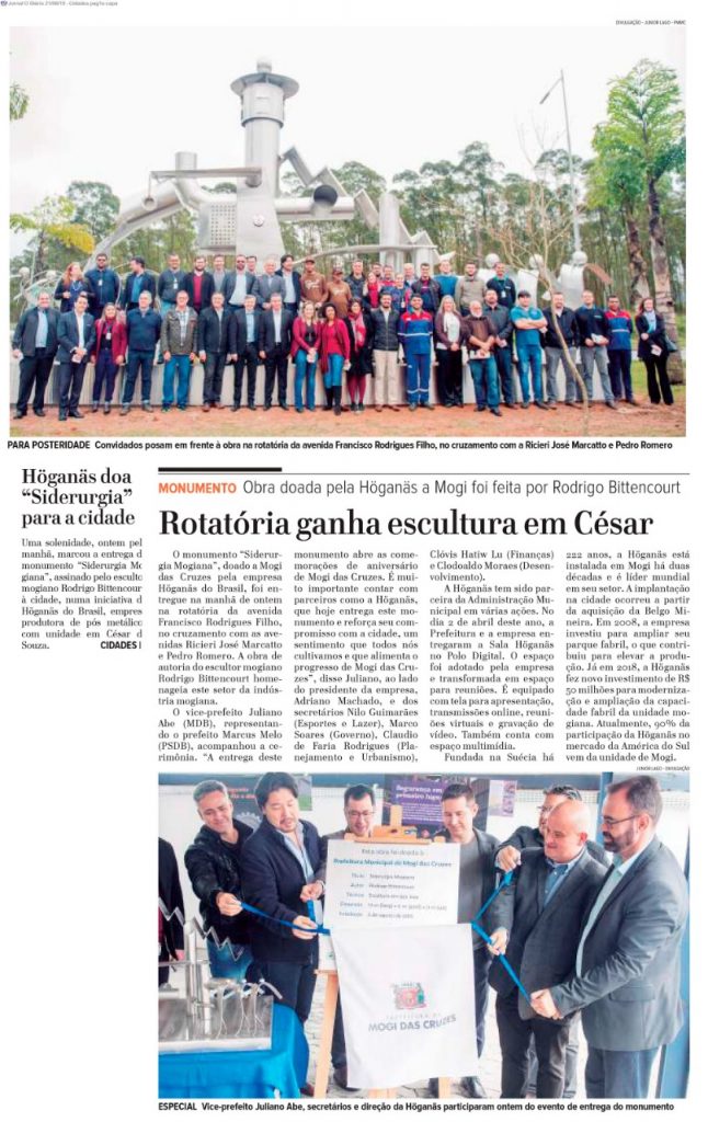 O monumento “Siderurgia Mogiana”, doado a Mogi das Cruzes pela empresa Höganäs do Brasil, foi entregue na manhã de ontem na rotatória da avenida Francisco Rodrigues Filho, no cruzamento com as avenidas Ricieri José Marcatto e Pedro Romero. A obra de autoria do escultor mogiano Rodrigo Bittencourt homenageia este setor da indústria mogiana.