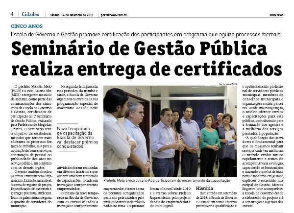 O prefeito Marcus Melo (PSDB) e o vice, Juliano Abe (MDB), entregaram no início da semana, como parte das comemorações dos cinco anos da Escola de Governo e Gestão, certificados de participação no 1º Seminário de Gestão Pública, realizado pela Prefeitura de Mogi das Cruzes. O seminário teve o objetivo de estabelecer métodos que tornem mais eficientes os processos formais de trabalho, seja para a aquisição de bens e serviços, contratação de pessoal ou publicidade dos atos no serviço público, em conjunto com os demais órgãos.