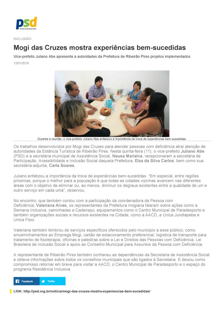 Vice-prefeito Juliano Abe e secretária Neusa Marialva recebem  a secretária de Participação, Acessibilidade e Inclusão Social de Ribeirão Pires, Elza da Silva Carlos, e sua adjunta, Carla Soares, que buscam mais informações sobre ações desenvolvidas em Mogi das Cruzes para beneficiar pessoas com deficiência.