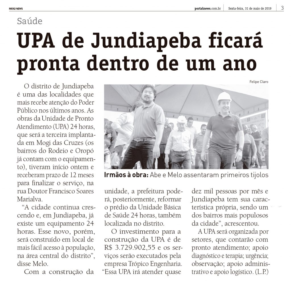 O distrito de Jundiapeba é uma das localidades que mais recebe atenção do Poder Público nos últimos anos. As obras da Unidade de Pronto Atendimento (UPA) 24 horas, que será a terceira implantada em Mogi das Cruzes (os bairros do Rodeio e Oropó já contam com o equipamento), tiveram início ontem e receberam prazo de 12 meses para finalizar o serviço, na rua Doutor Francisco Soares Marialva.